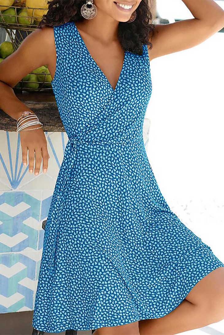 Cette robe courte et insolente est parfaite pour les chaudes journées d’été, que vous vous promeniez sur un marché de producteurs ou que vous preniez quelques rayons à la plage. La couleur bleu profond est chic et flatteuse, tandis que le col en V et la coupe sans manches gardent les choses fraîches et confortables. La taille ajustée flatte votre silhouette, et la jupe tombe juste au-dessus du genou pour un look coquet mais modeste.
