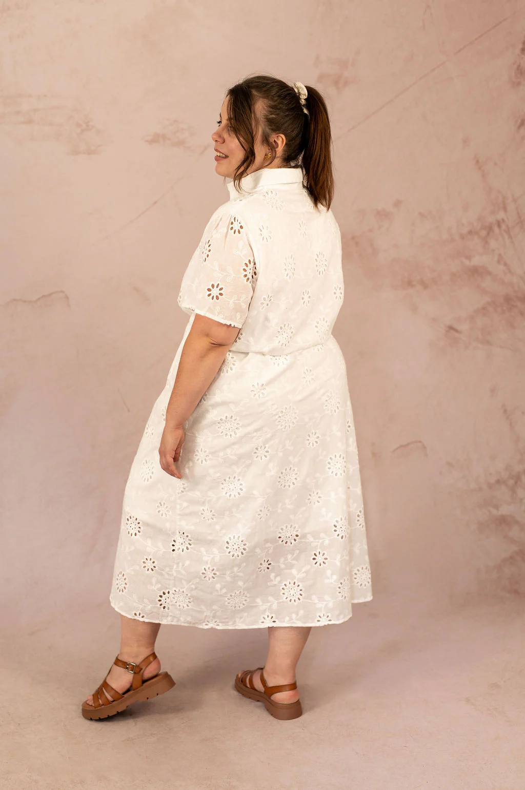 Associez la robe chemise en broderie anglaise Robe Elisabeth avec des sandales en cuir ou des espadrilles pour une allure estivale chic. Une pièce phare de notre collection de vêtement grande taille, pensée pour mettre en valeur toutes les morphologies avec élégance.