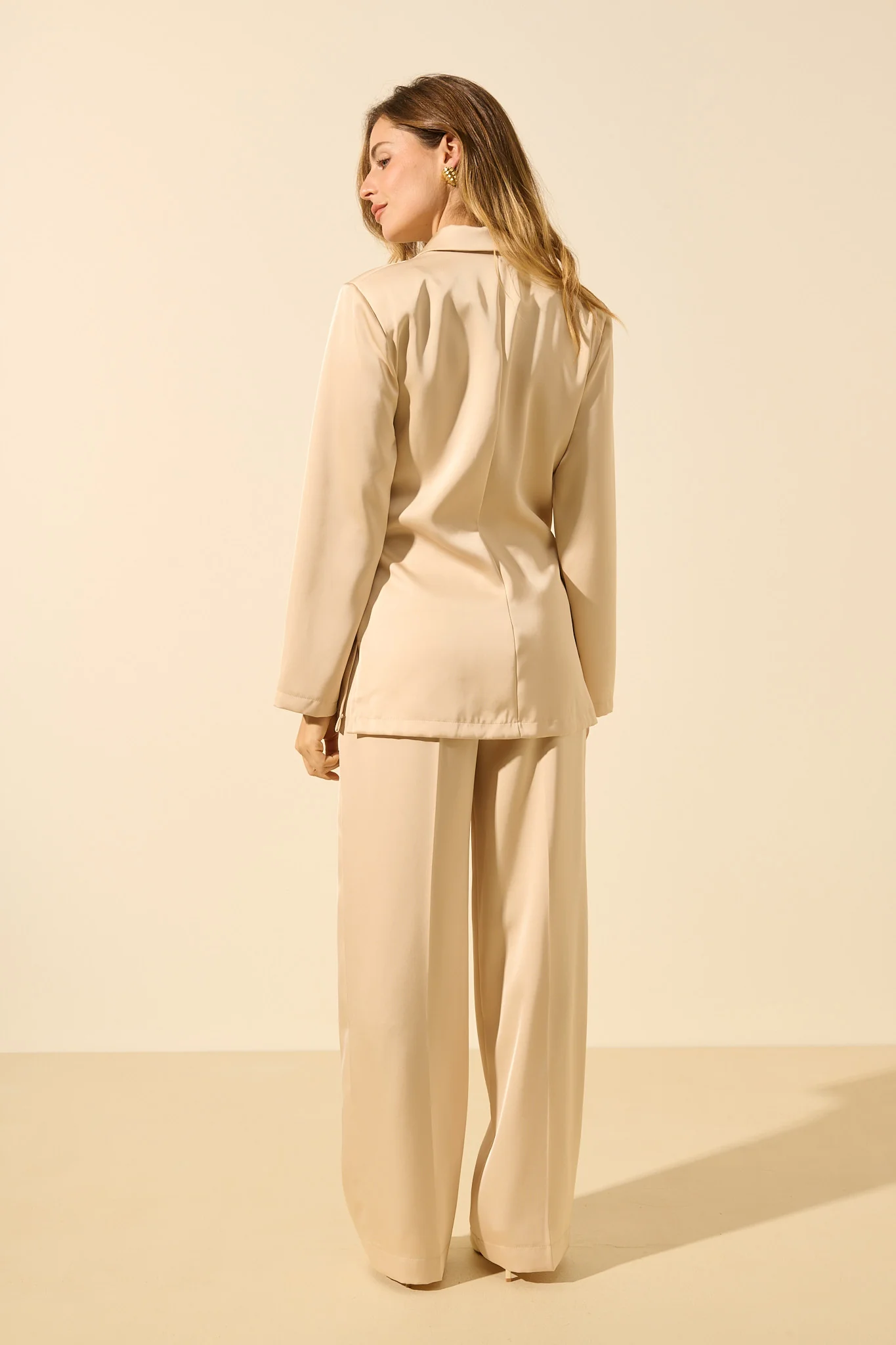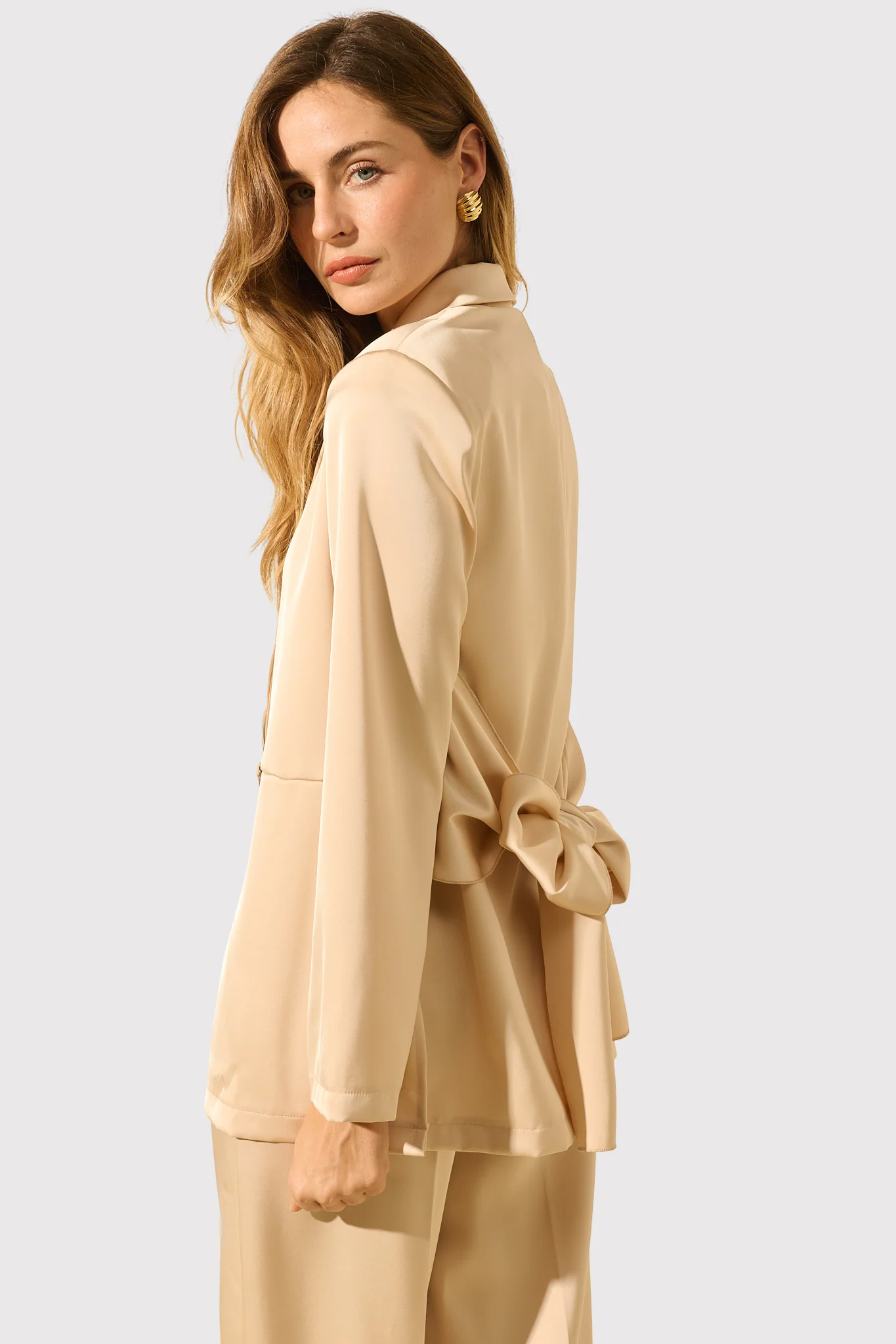 On revisite l’intemporelle veste de tailleur pour la saison ! Matière fluide, satinée et épaulettes qui accentuent sa coupe structurée. La ceinture est à nouer à l’avant ou à l’arrière, selon vos envies.