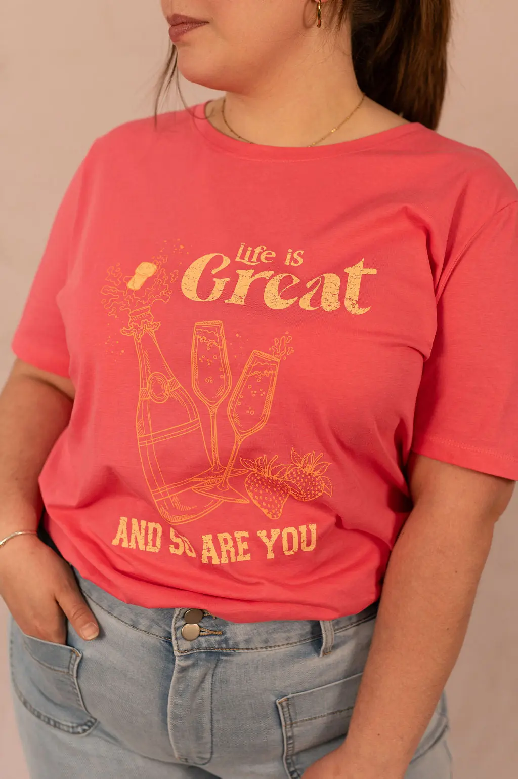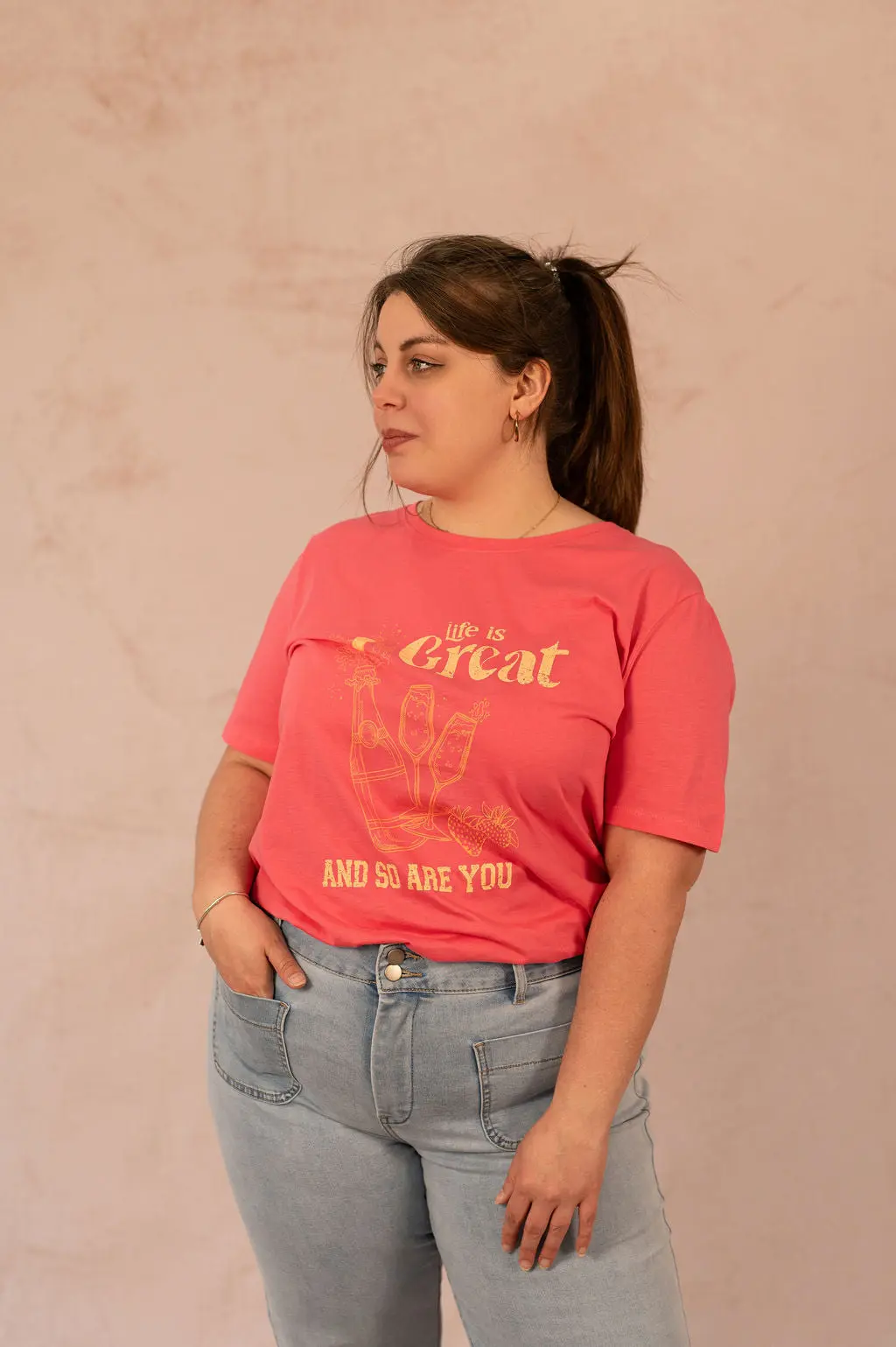 Imprimé “coquillage” sur la poitrine ou “life is great” avec visuel champagne à l’avant