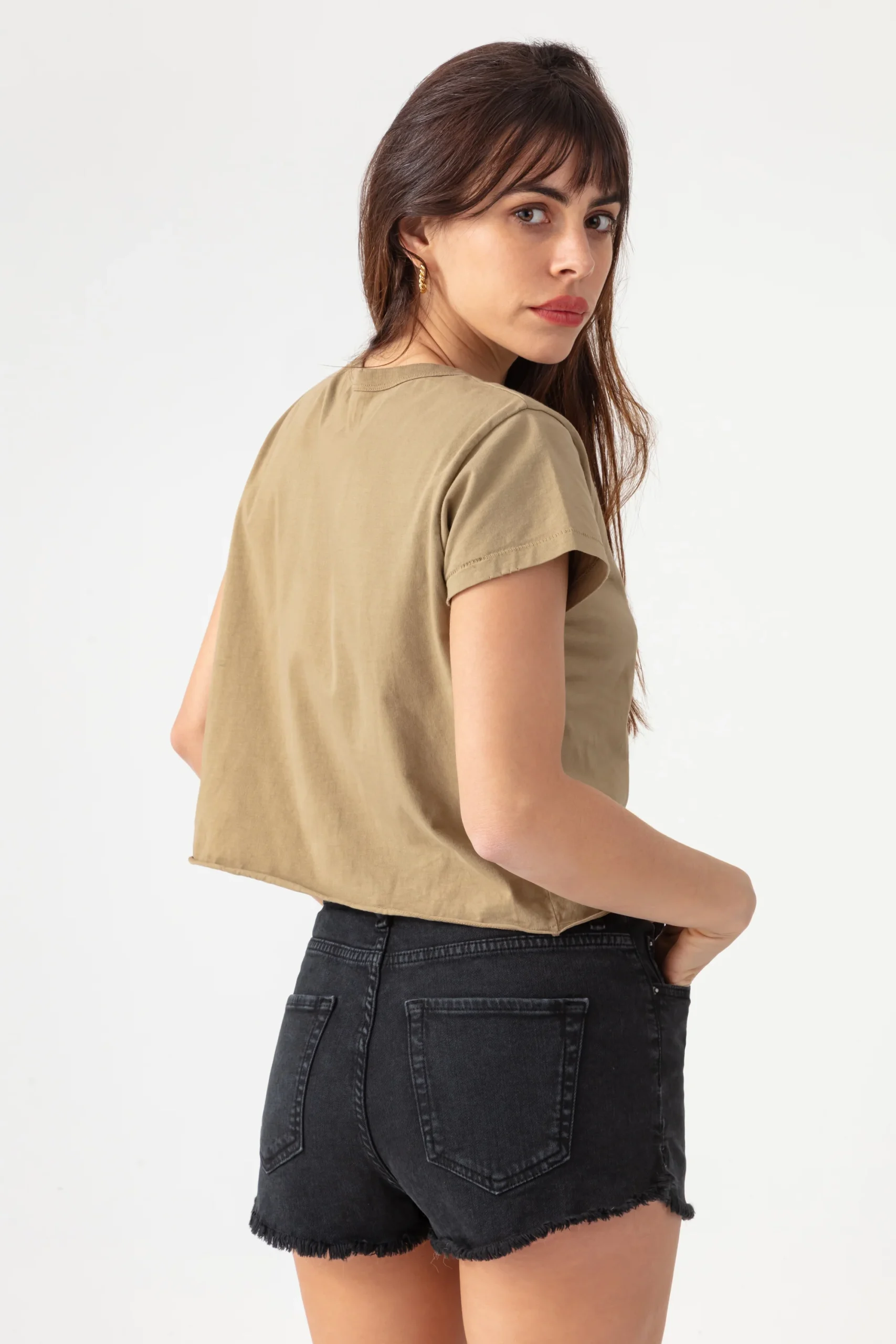 Optez pour l’élégance décontractée avec notre T-shirt col rond. Coupe cropped, manches courtes, en coton premium avec un effet usé subtil sur le col et les manches.