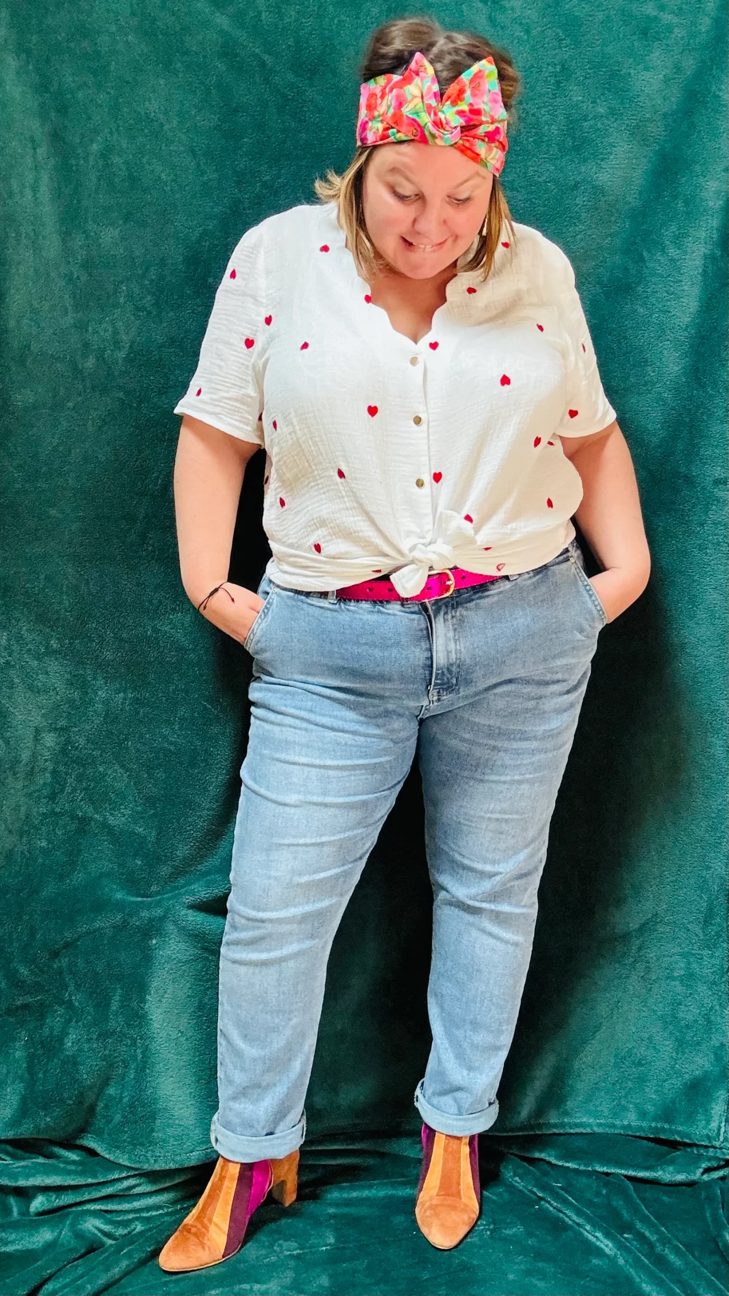 Laissez-vous séduire par notre top grande taille avec des motifs cœurs disponibles en rouge, bleu ou rose. Conçu en gaze de coton, ce top est léger, confortable et idéal pour les jours où vous souhaitez allier élégance et confort. Le décolleté en vague met en valeur la poitrine, tandis que les petits boutons dorés jusqu’en bas ajoutent une touche de sophistication. Les manches fluides sont parfaites pour celles qui ont des complexes au niveau des bras, offrant une allure romantique et décontractée.