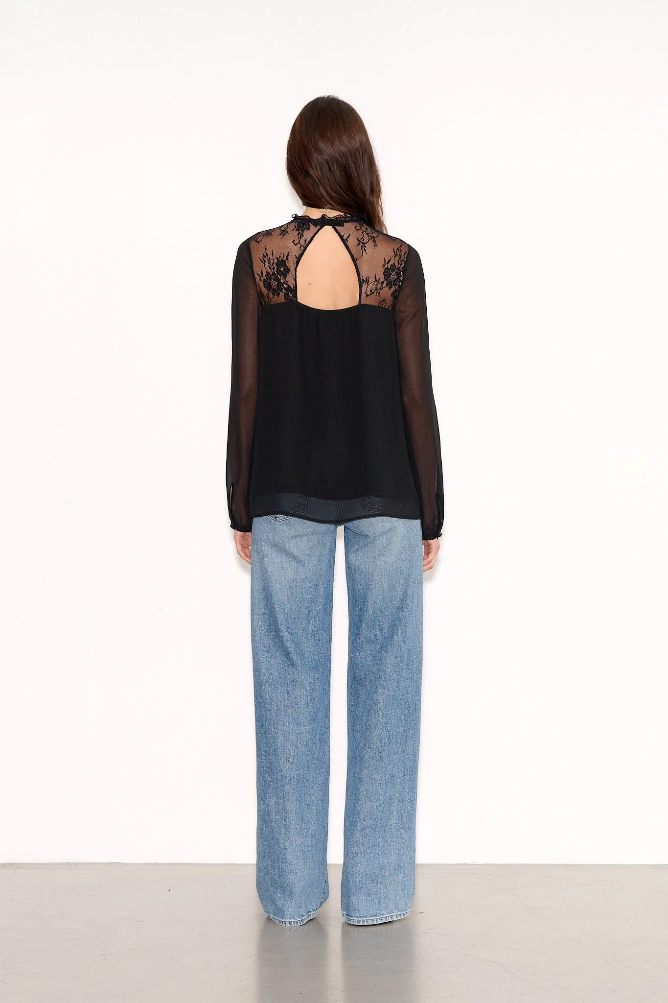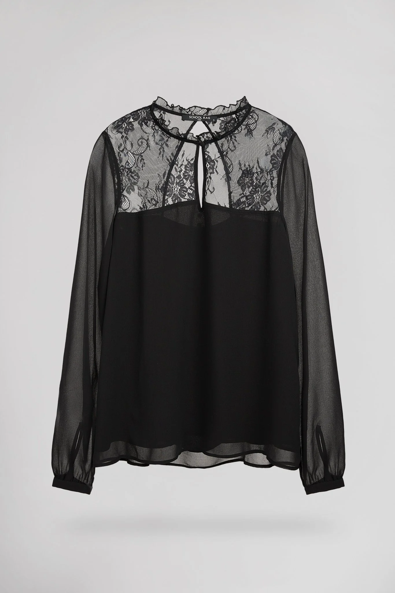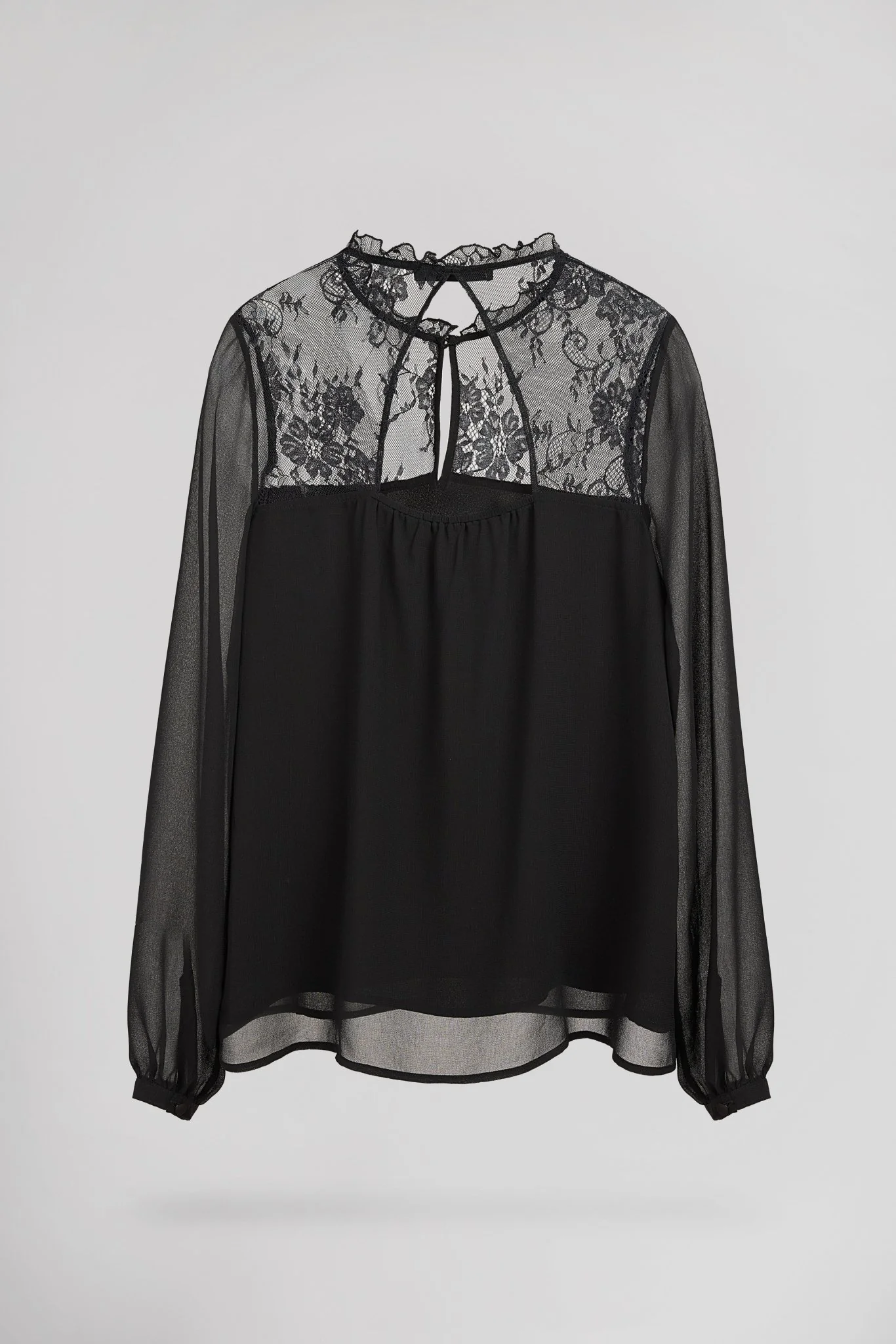 - Manches longues en voile transparent, froncées au-dessus des poignets boutonnés