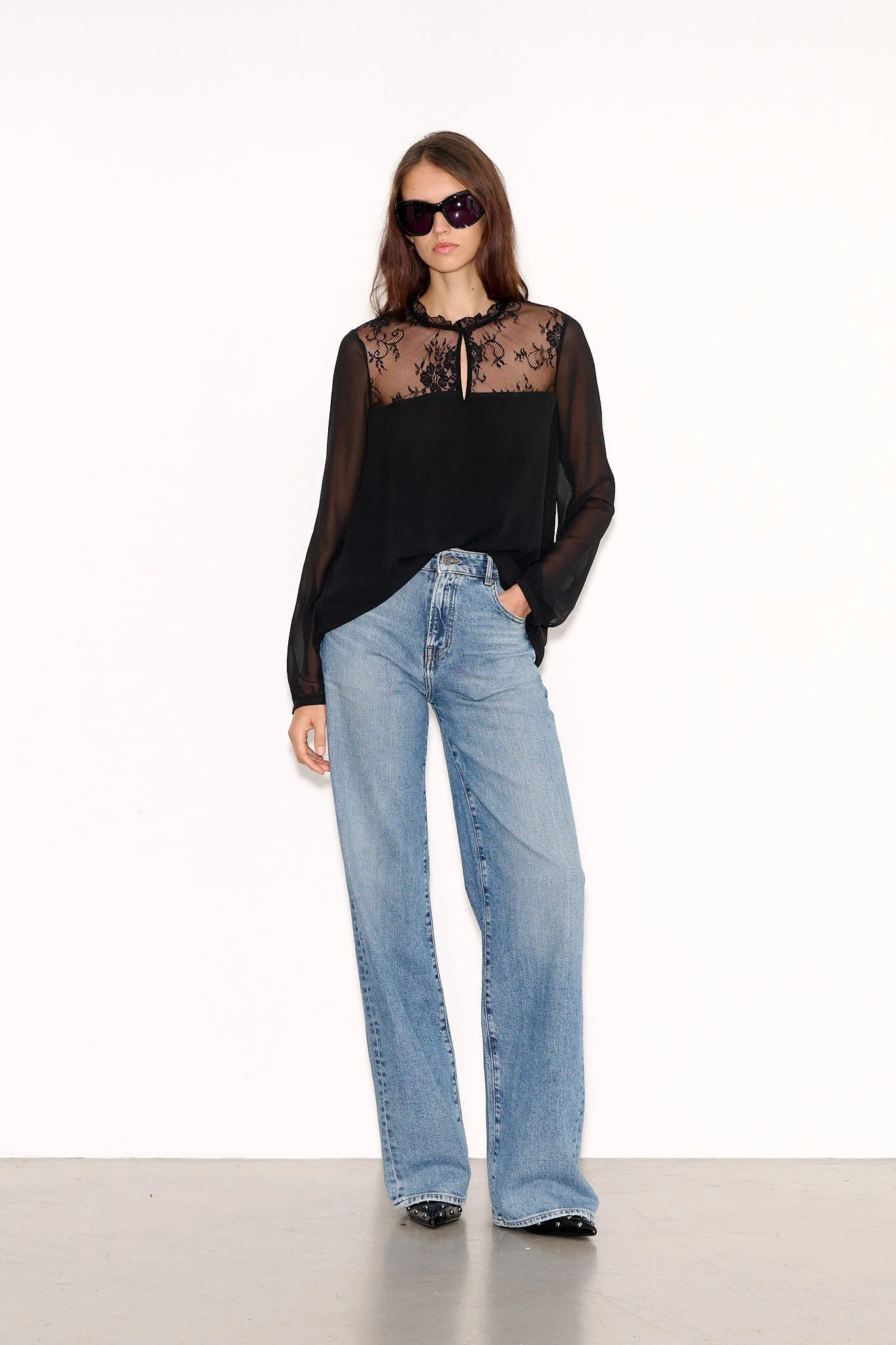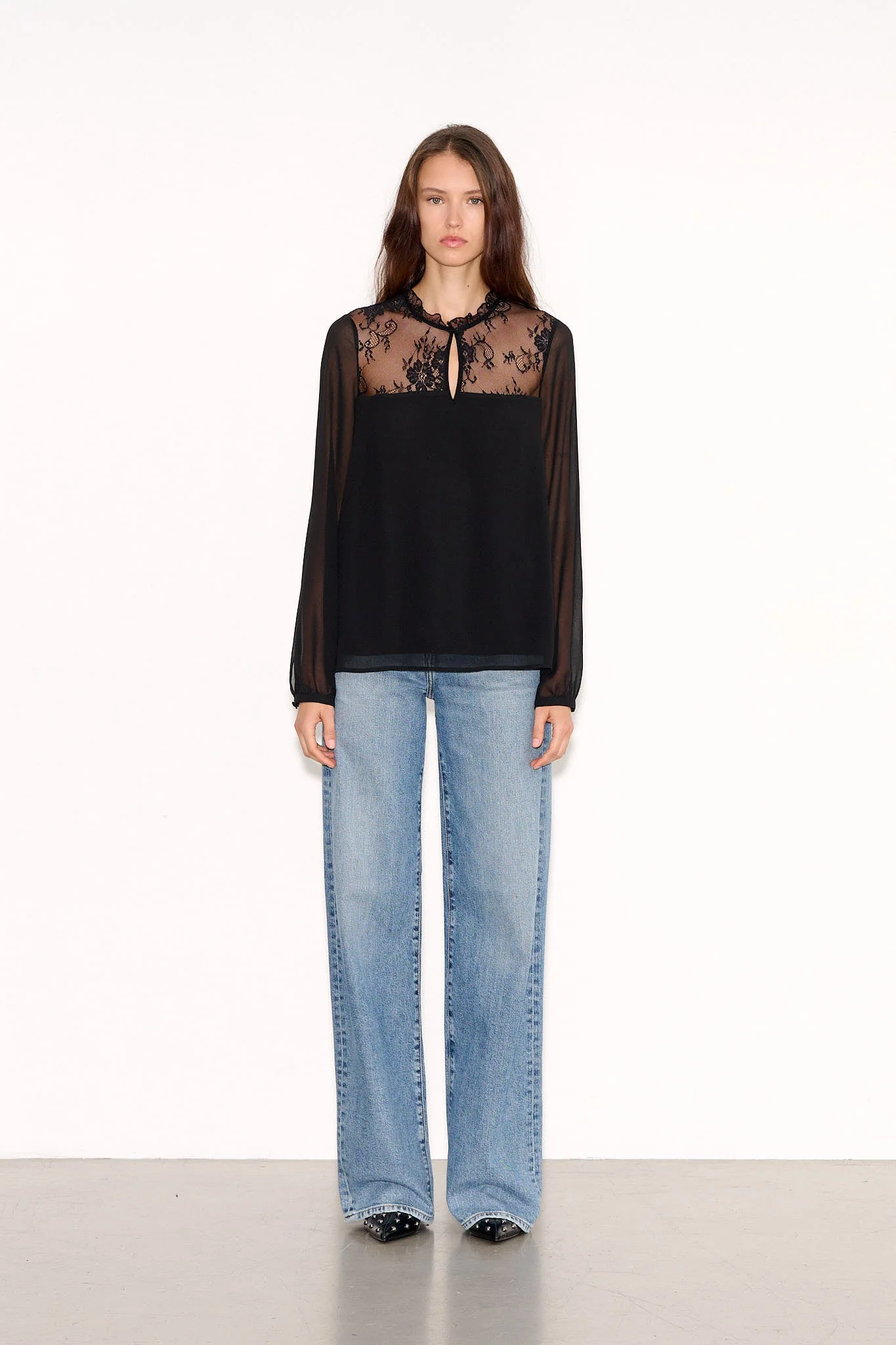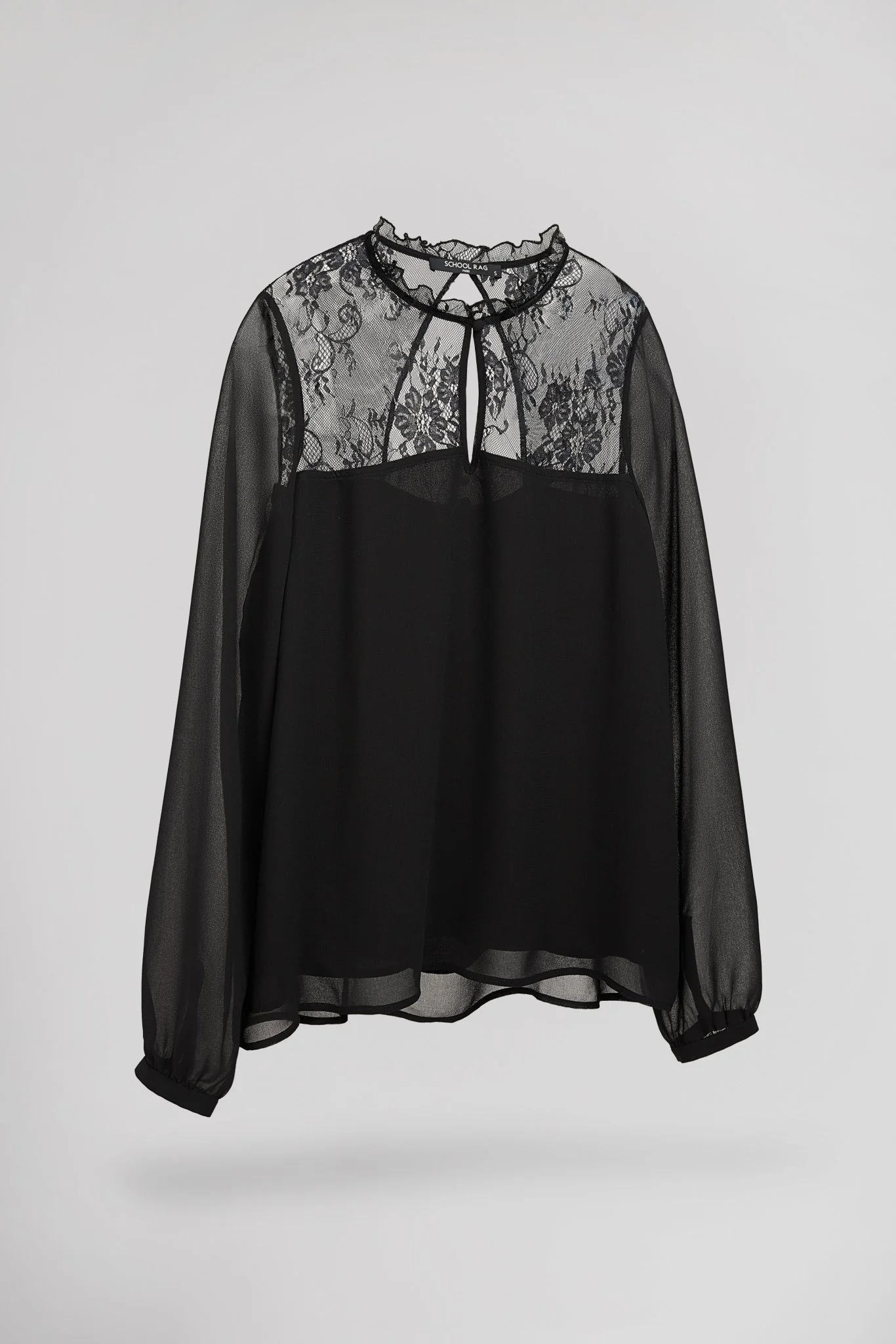 - Manches longues en voile transparent, froncées au-dessus des poignets boutonnés