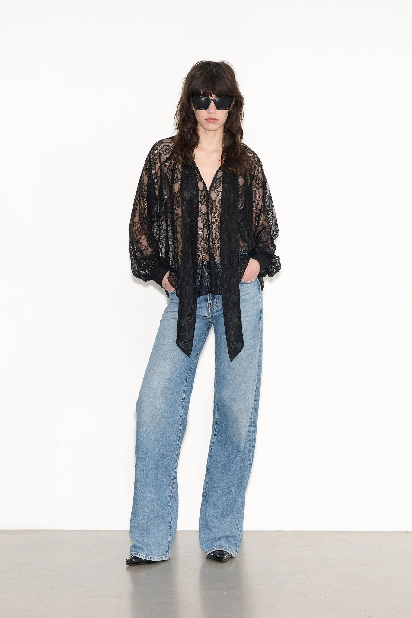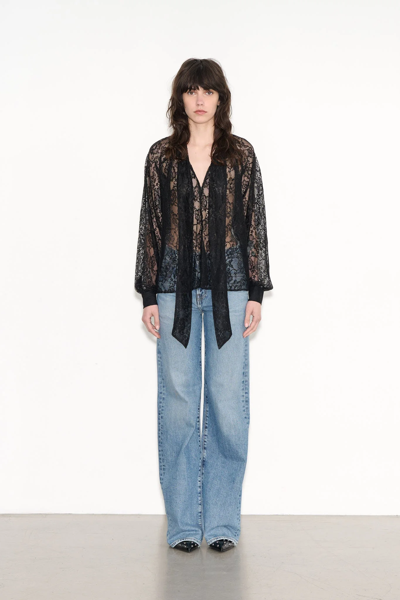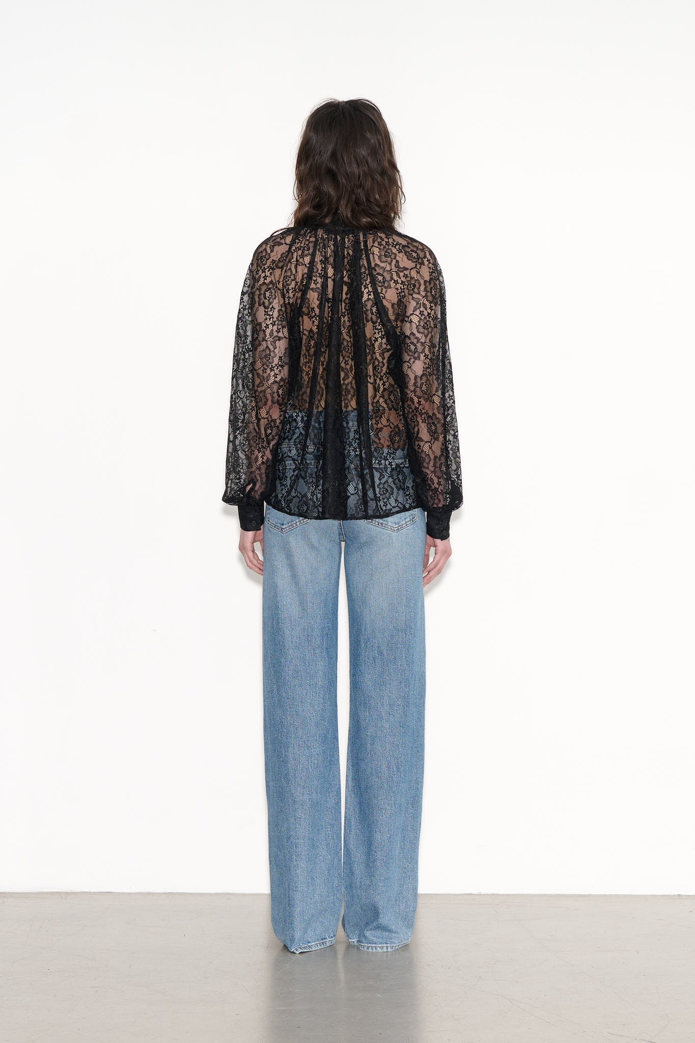 Top ample, coupe évasée Encolure ronde froncée Fente à l’encolure devant, fermeture avec de larges liens à nouer sur le devant Larges manches longues raglan froncées avec poignets boutonnés Longueur depuis l’épaule pour une taille S : 60 cm