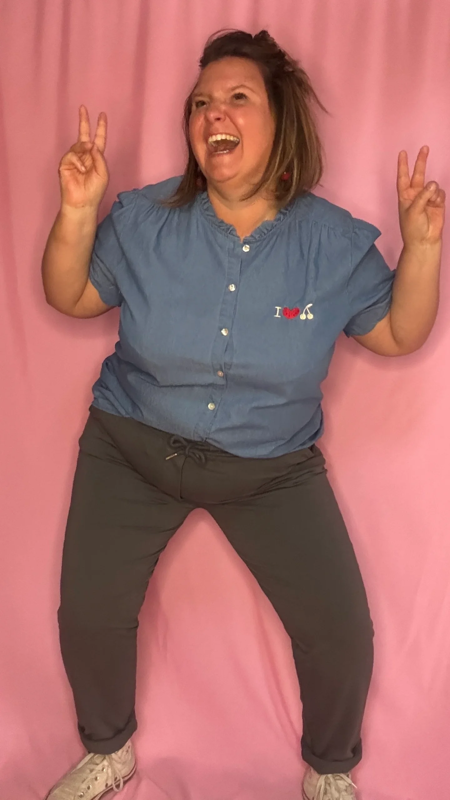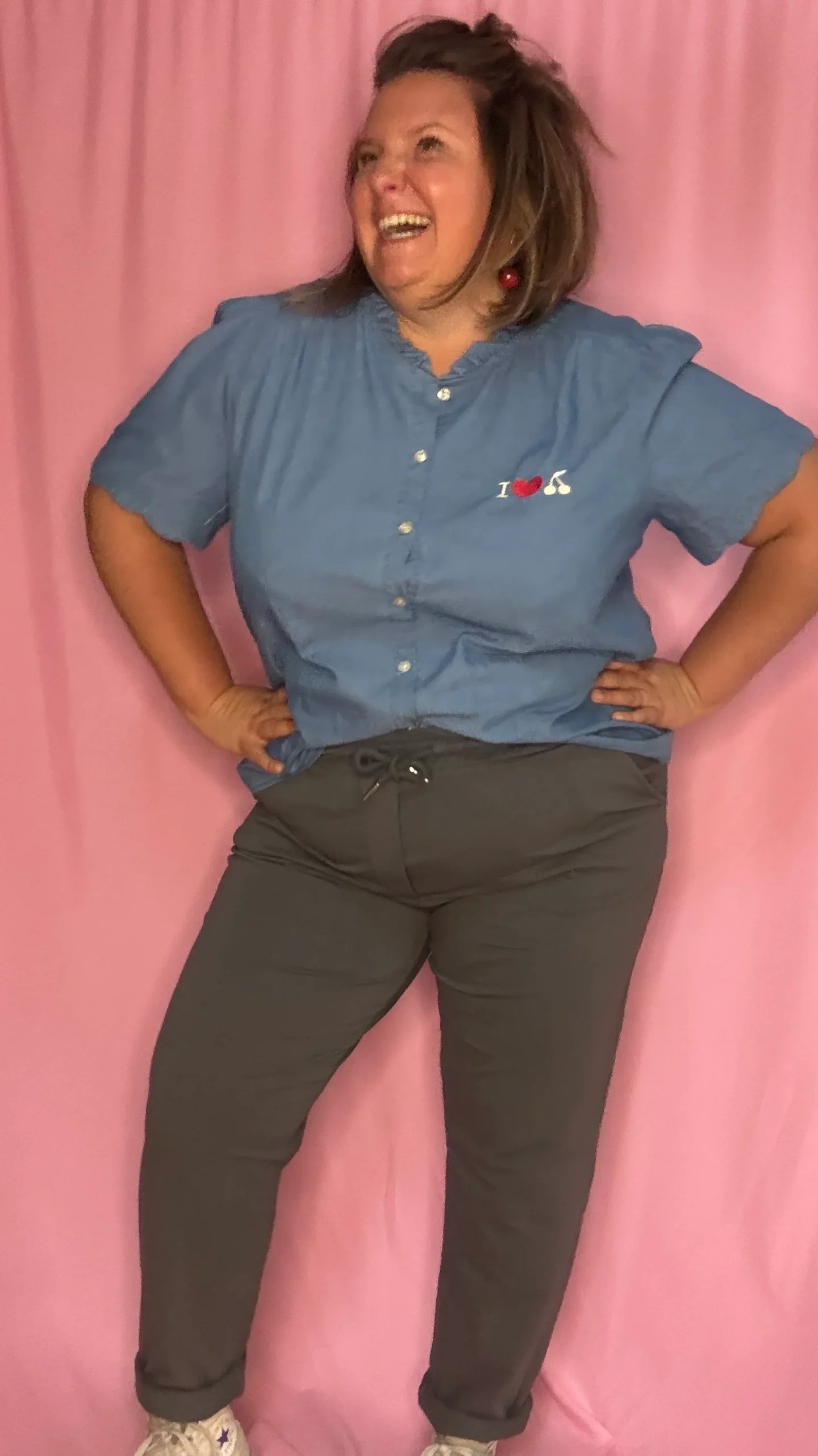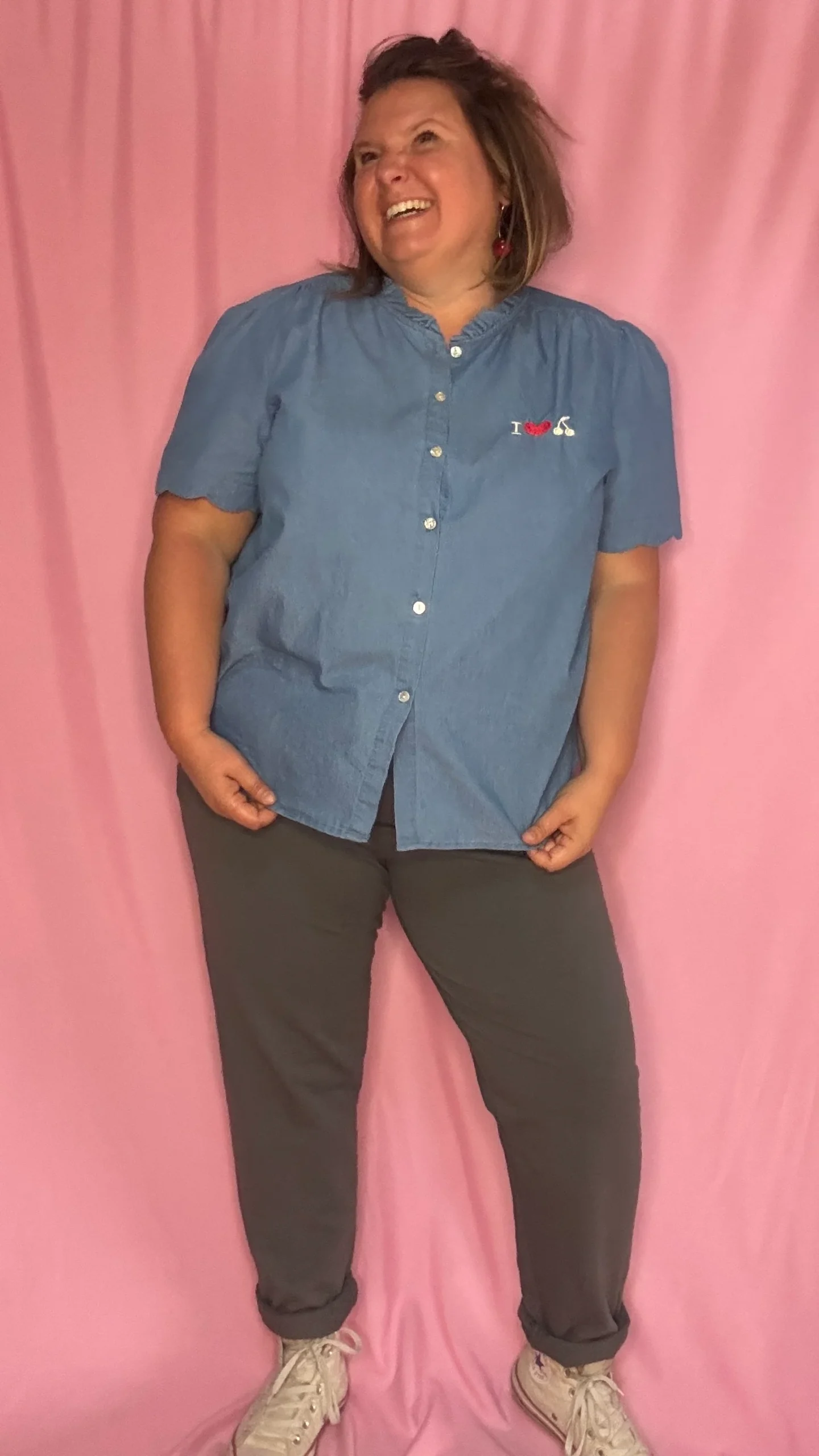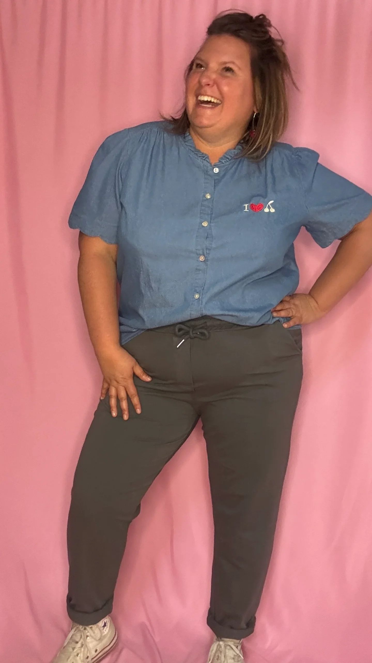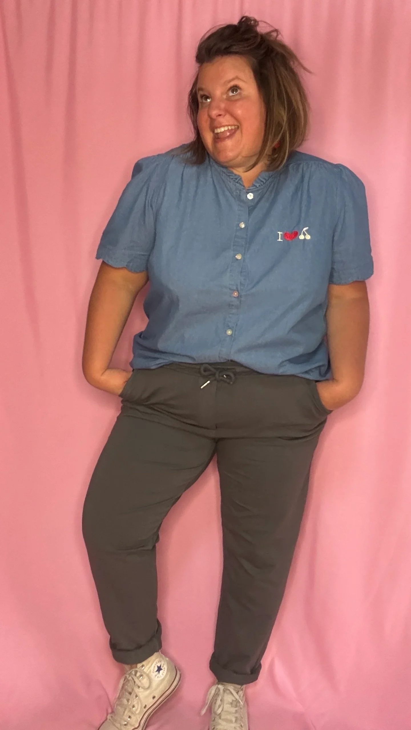 Un top/blouse grande taille 100% coton à la fois confortable, original et très agréable à porter ! Sa couleur bleu jean clair s’accorde facilement à toutes vos tenues, et son motif rouge « I love cerise » apporte une note pétillante et fun à votre look 🍒.