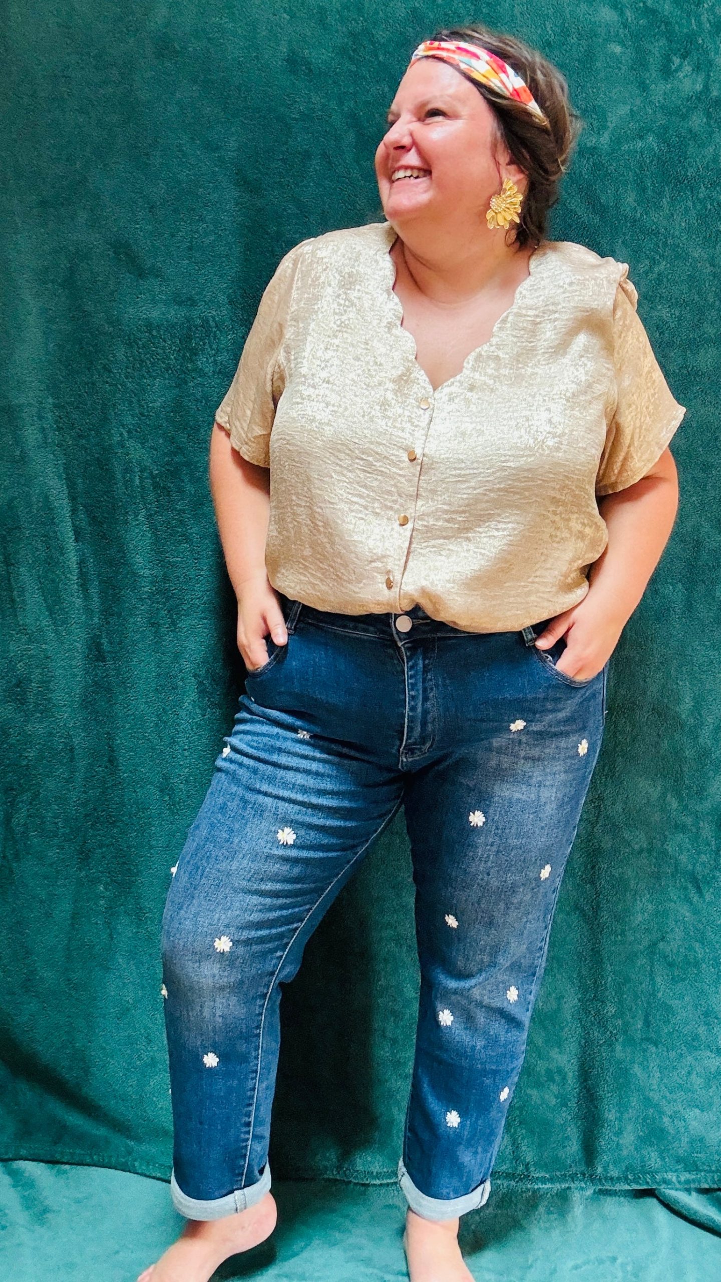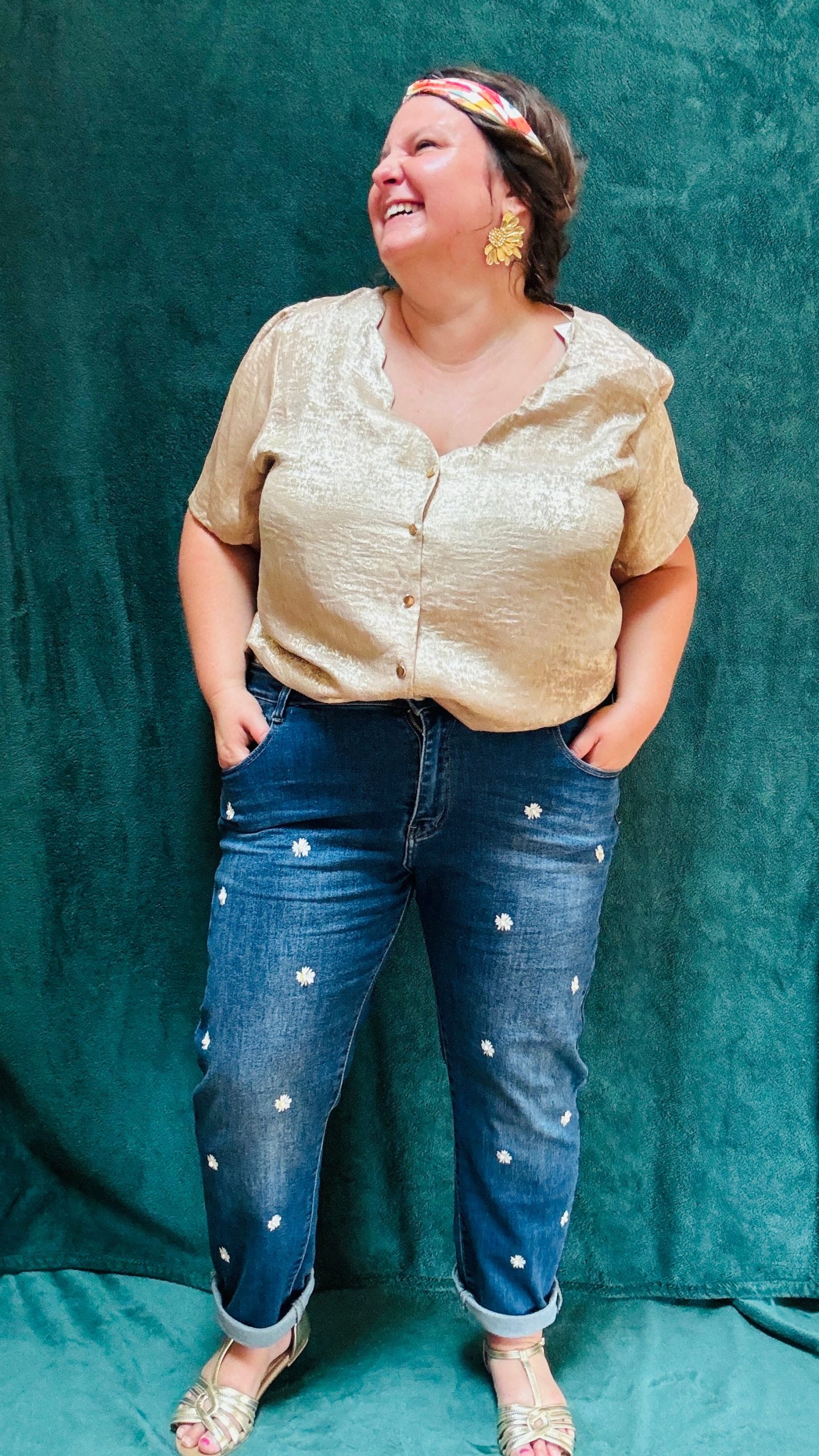 Sublimez votre look avec notre top grande taille doré irrisé, conçu pour apporter une touche de glamour et d’audace à votre garde-robe. Ce top léger et fluide est parfait pour toutes les occasions, que ce soit pour le quotidien ou une soirée estivale.