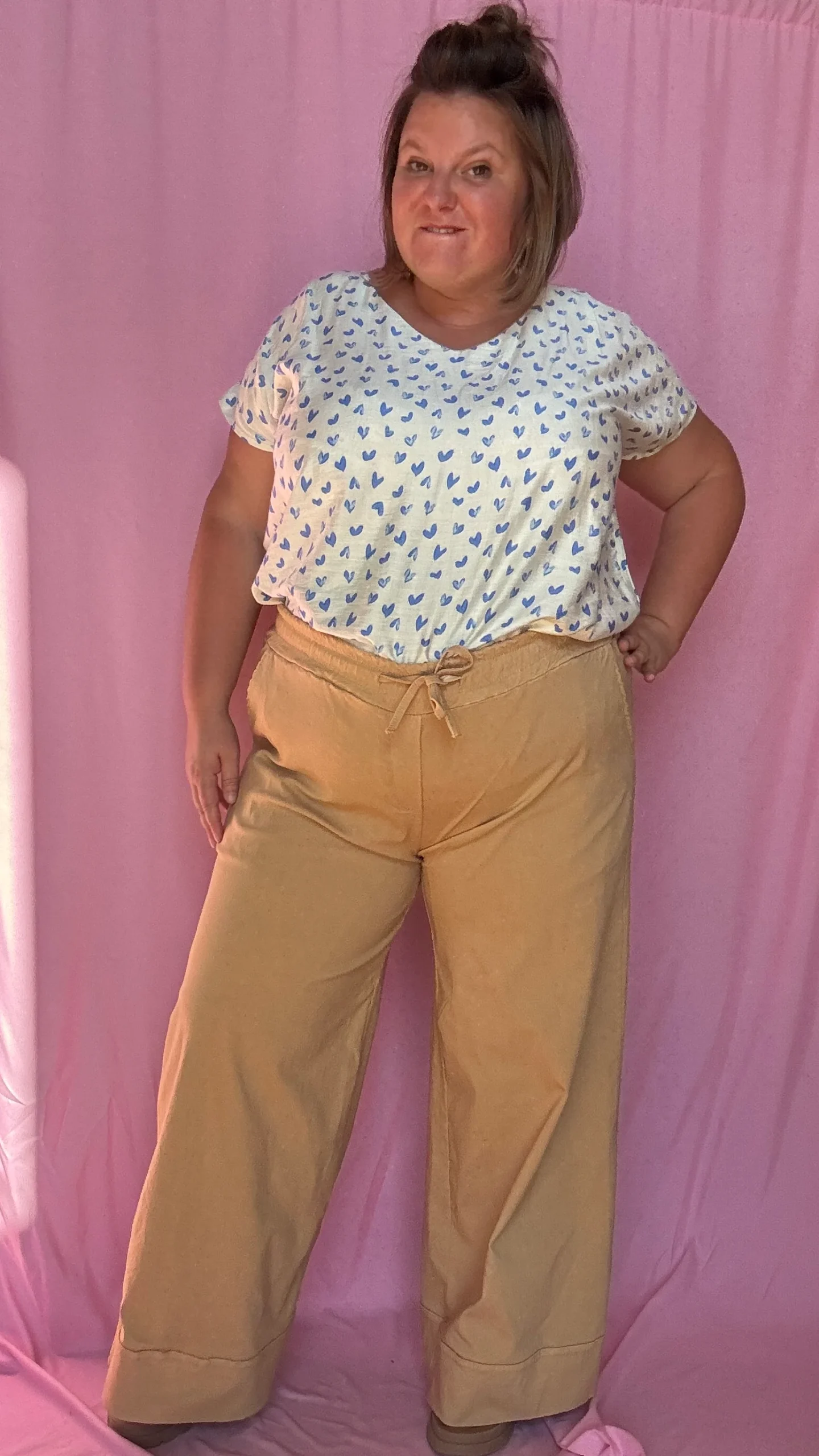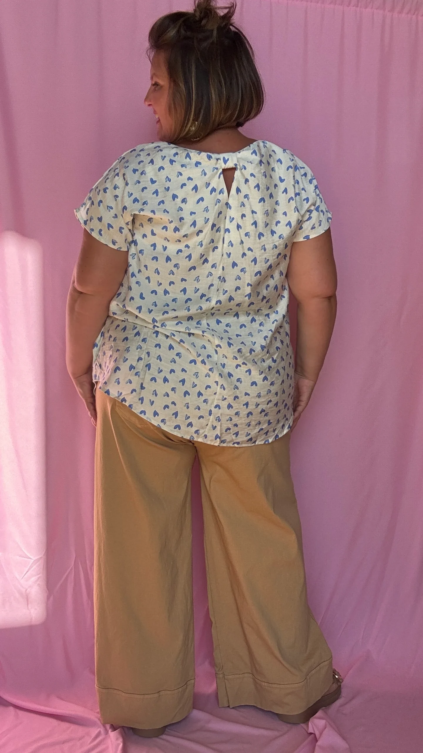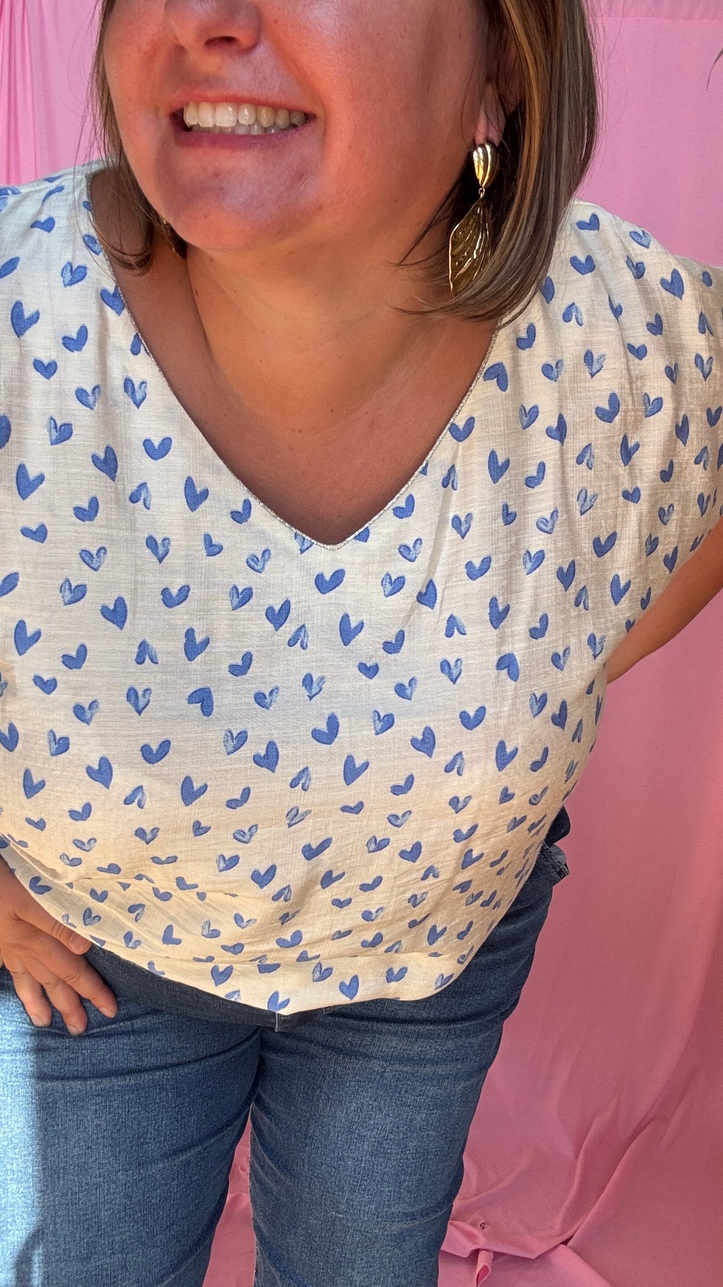 Un top grande taille adorable et romantique, parfait pour toutes les occasions 💙 Son motif cœur bleu sur fond beige lui donne un charme doux et féminin, idéal pour ajouter une touche tendre à toutes tes tenues.